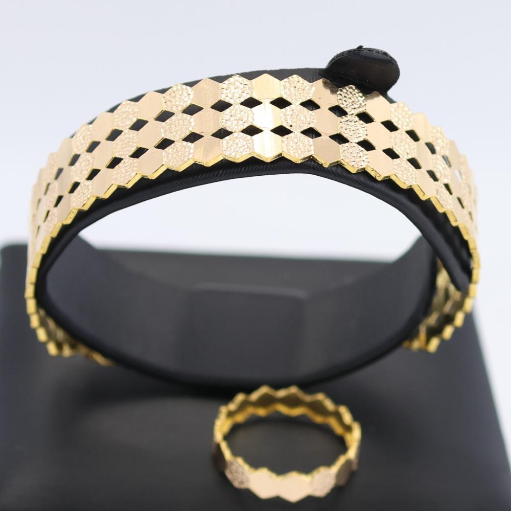 أسوارة وخاتم ذهب سداسي بتصميم ثلاثي الأدوار، عيار 21، يعكسان الفخامة والأناقة في كل تفاصيلهما، ليمنحاك إطلالة ساحرة ومميزة.
