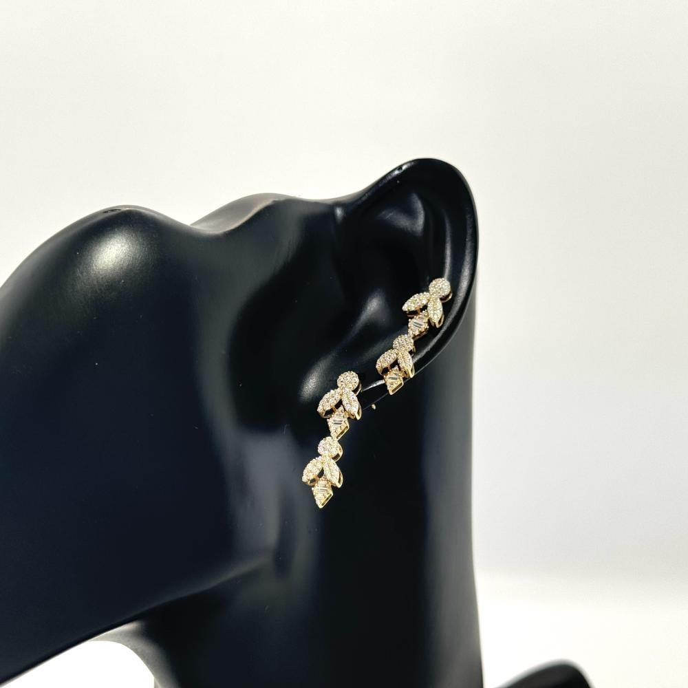 حلق زهرة اللافندر من الذهب عيار 18 بتصميم ماسي يعكس روعة الطبيعة وأناقتها. كأنها زهرة حقيقية ارتدت ثوبًا من الذهب الأصفر اللامع، تتفتح بتلاتها برقة ودقة متناهية. في كل بتلة تتلألأ براقة. تتوسط الزهرة قطعة اصغر تشبه الندى المتلألئ في ضوء الصباح. تصميم الحلق يجسد جمال اللافندر الطبيعي، مع إحساس بالفخامة والأنوثة.