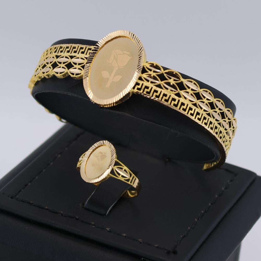 أسوارة وخاتم ذهب عيار 21 بتصميم سبيكة بارزة، يجمعان بين القوة والفخامة في تفاصيل دقيقة تضيف لمسة مميزة وأنيقة لإطلالتك.