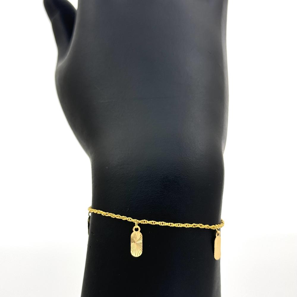 اسوارة ذهب مبروم بقطع هندسية جميلة عيار 18 تجمع بين التصميم الملتف والأشكال الهندسية الأنيقة. تضيف هذه الاسوارة لمسة من الجمال والتفرد، مما يجعلها قطعة رائعة تعزز من أناقتك وتكمل إطلالتك بلمسة عصرية.