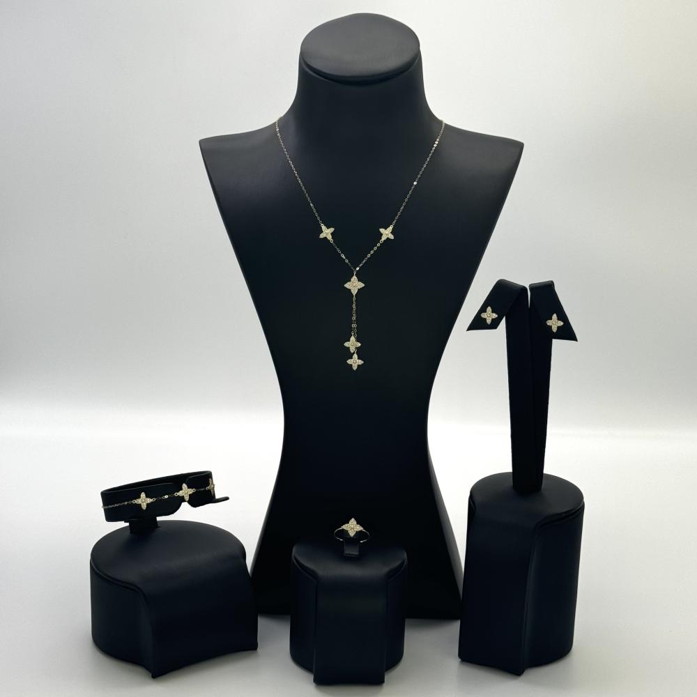 طقم ذهبي يتضمن حلق مطابق، أسوارة، وخاتم، يتميز بتصميم مستوحى من نجوم بيضاء، مصنوع من عيار 18 قيراط من الذهب الخالص. يتألق الطقم بلمسة فريدة من الفخامة والأناقة، مع تفاصيل دقيقة تبرز جمال الذهب والماس. يعكس هذا الطقم روعة وأناقة الذوق الرفيع، مضيفاً لمسة من الجمال والسحر إلى أي إطلالة.
