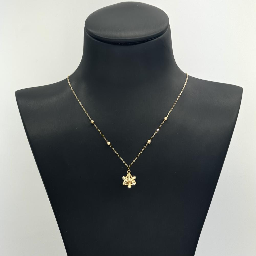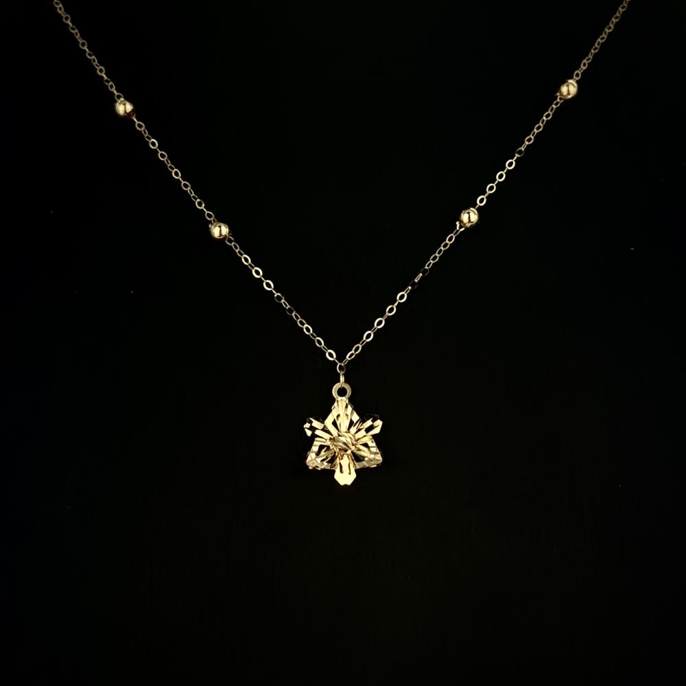 اكتشف أناقة الذهب الفريدة مع عقدنا الذهبي بتصميم مثلث ووردة فاخرة!" "اضف جمالًا متألقًا إلى إطلالتك مع عقد ذهبي مميز يجمع الأناقة.