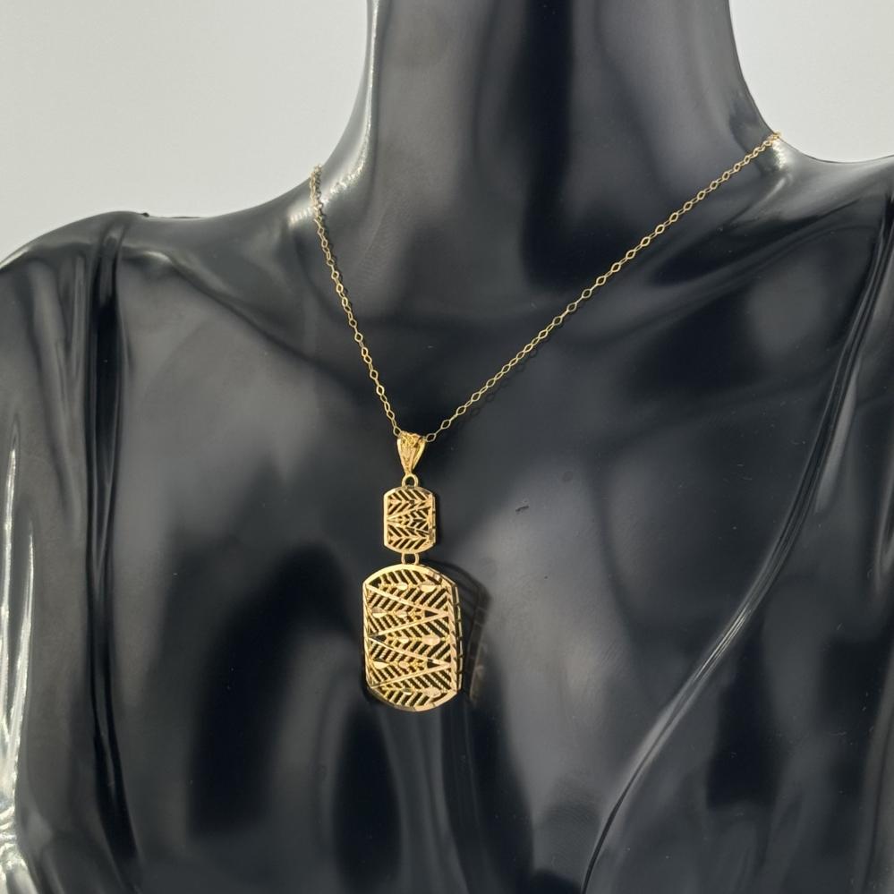 نصف طقم أنيق من ذهب عيار 21 يتألف من عقد عريض بتصميم متقن من مربعات مترابطة تضفي بريقًا لافتًا على العنق، وخاتم بنفس الأسلوب الهندسي الجديد يعكس الضوء ليتناسب مع مختلف الأحجام، بالإضافة إلى حلق خفيف الوزن يتكامل مع باقي القطع ليعزز جمال الوجه بلمسة من الفخامة والمثالية لمختلف المناسبات ويضمن تناغمًا بصريًا رائعًا يضفي تميزًا على إطلالتك اليومية و المناسبات.