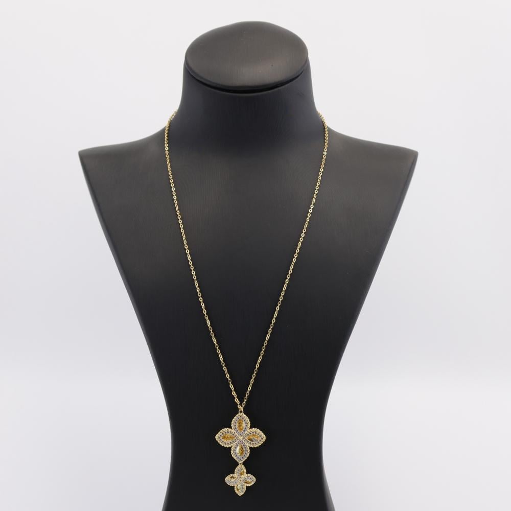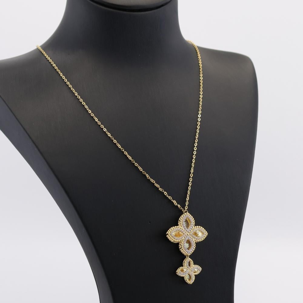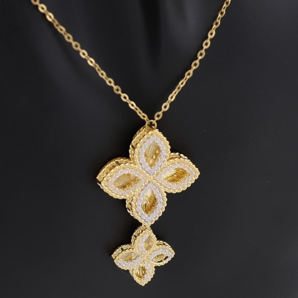 عقد أنيق ومميز، بتصميم زهرتين يلمعان ببريق يشبه الألماس، بتقنية ثلاثية الأبعاد. مصنوع من ذهب نقي عيار 18.