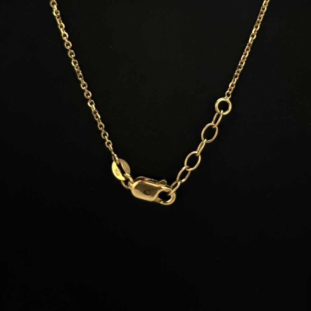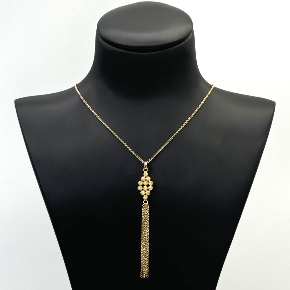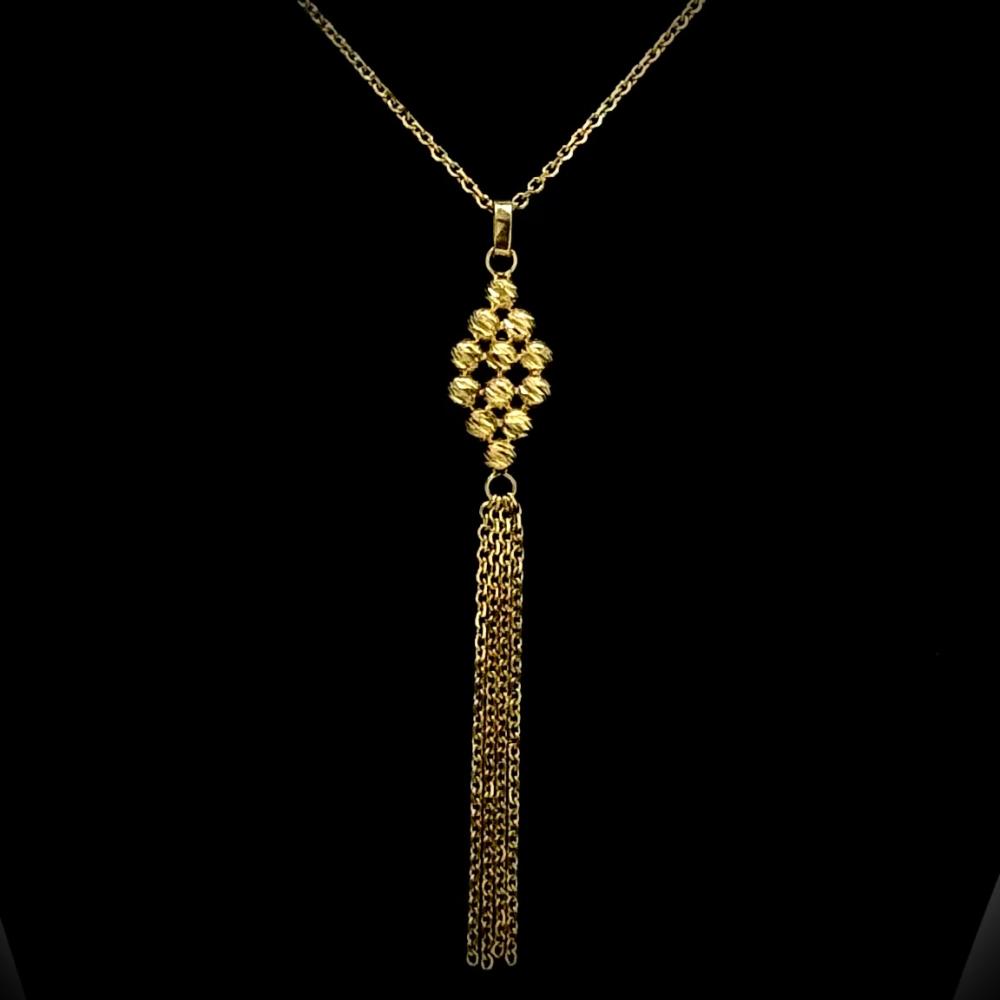 عقد ذهب عيار 18 يتكون من الذهب الصافي، يتميز بكرات ليزر متلاصقة في منتصفه، وتتدلى من تحتها خيوط سلاسل ذهبية، مما يضف جمالاُ لعنقك .