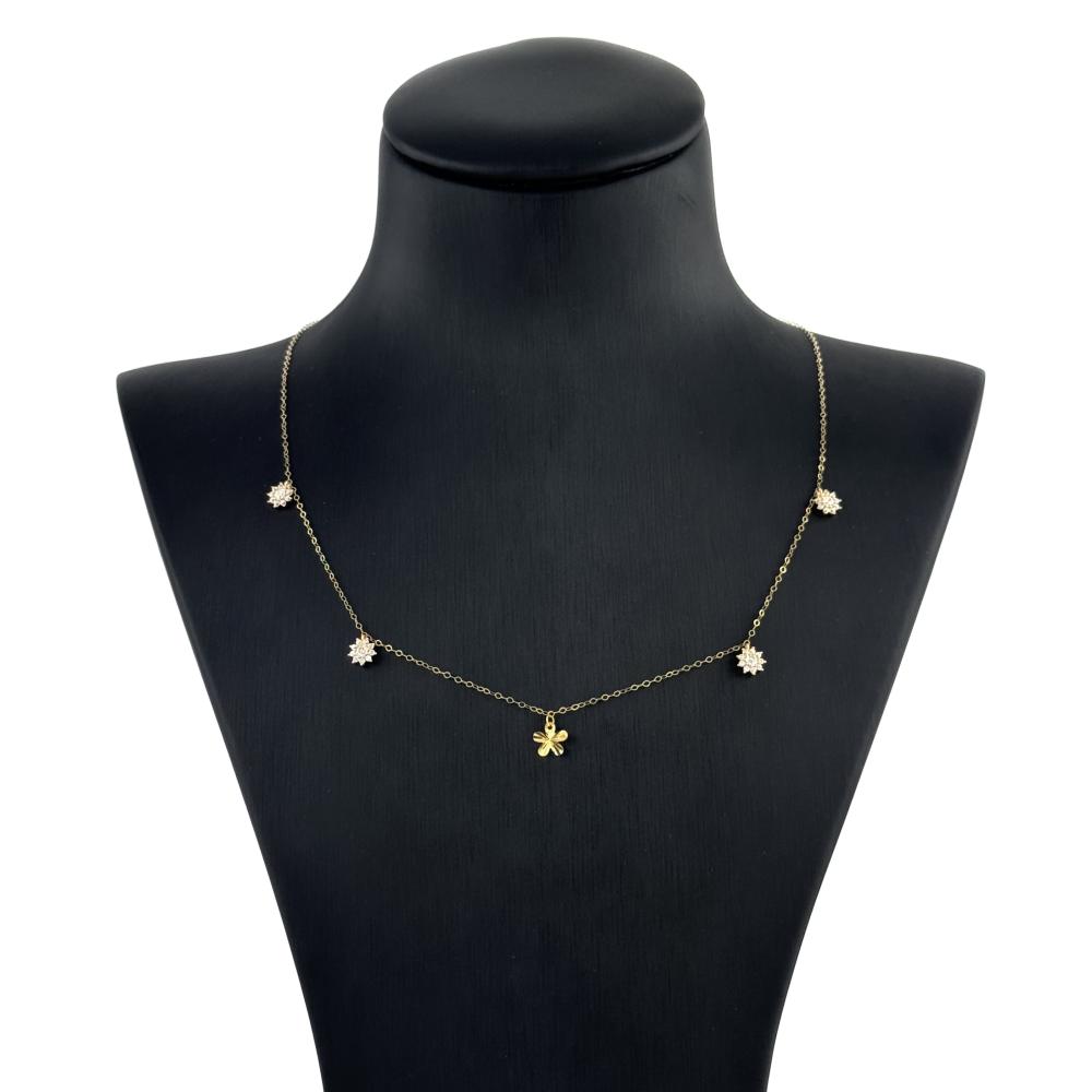 شوكر ذهب عيار 18 مزين بأربع ورود روند، مع زهرة مفتوحة في منتصف العقد، يجمع بين الأناقة والجمال الطبيعي في تصميم واحد.