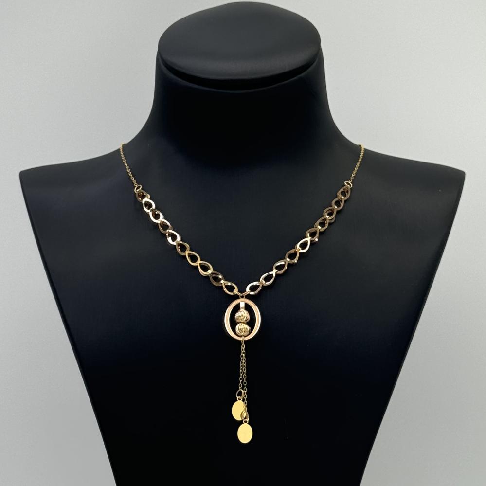 استمتع بأناقة لا مثيل لها مع عقد الذهب عيار 21 بتصميم دائرة مزين بكرتين ليزر، مربوط بسلسلة فاخرة، وتحت كل كرة ليزر، يمتد خيطين من الذهب لمزيد من الأناقة. اكتشف جمال وروعة مجوهرات قصر الدلمون بعيارات مختلفة، وتمتع بتصاميم فريدة وراقية تجسد الفخامة والأناقة. استمتع بالتألق والتميز مع مجوهراتنا الراقية والمتميزة.