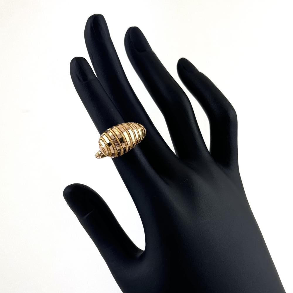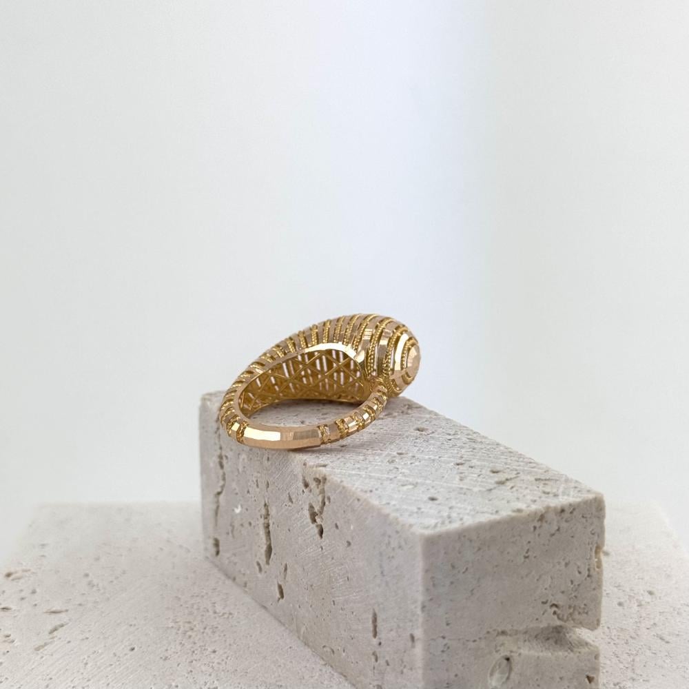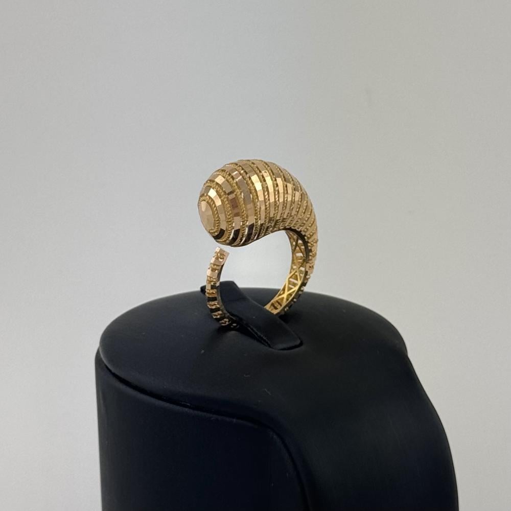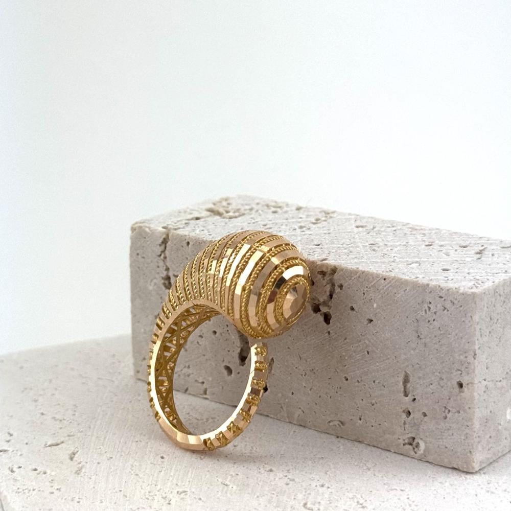 خاتم بتصميم جريء يجمع بين الشكل الحلزوني والبوقي، مصنوع من ذهب عيار 21. يضفي الخاتم لمسة من الحركة و الموضة ، مثالي للمرأة العصرية التي تبحث عن التفرد والابتكار في إطلالتها.