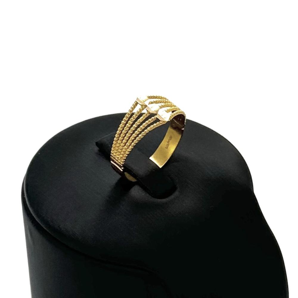 خاتم ذهبي عيار 21 يتميز بتصميم شكل خيوط يجمع بين ثلاث كرات ليزر في المنتصف، مما يضفي عليه مظهرًا متألقًا وفريدًا يبرز جمال الذهب العالي الجودة.