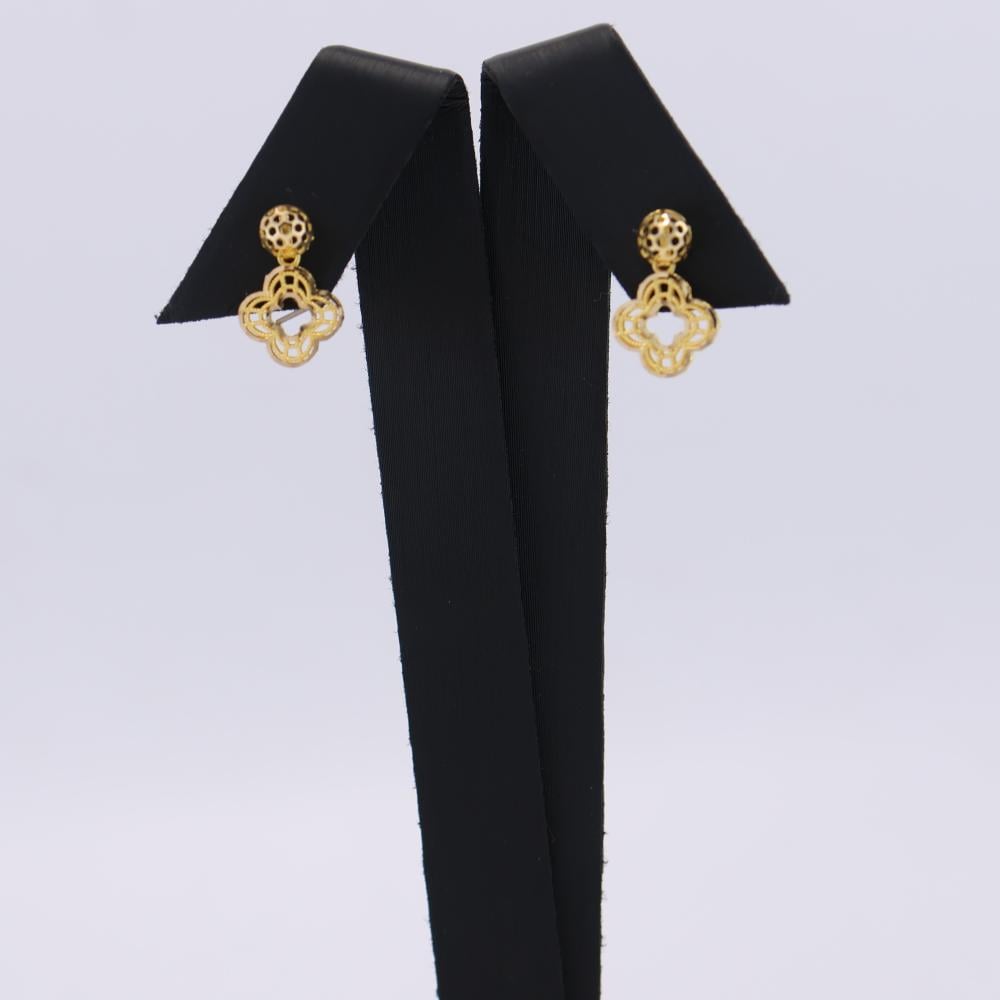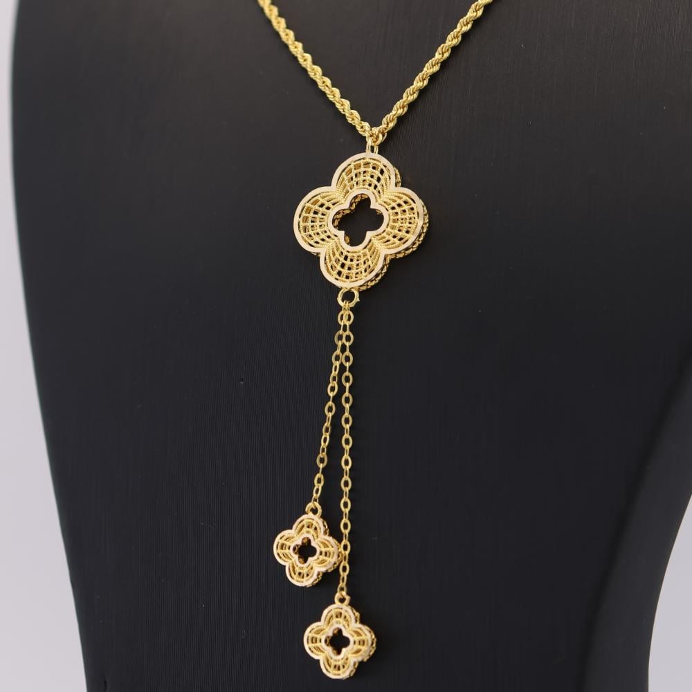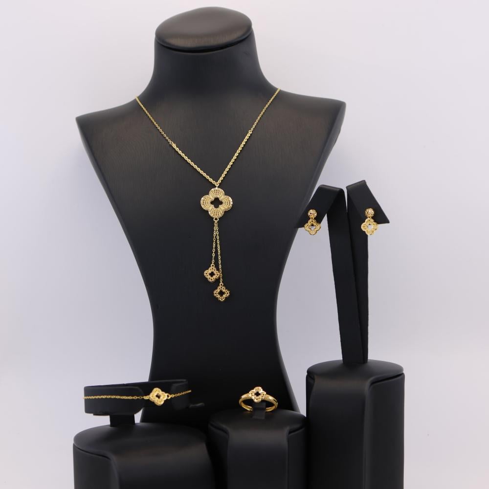 طقم ذهب 21 قيراط بتصميم زهرة كبيرة وقطعتين متدليتين يجمع بين الأناقة والجمال الأنثوي الساحر.