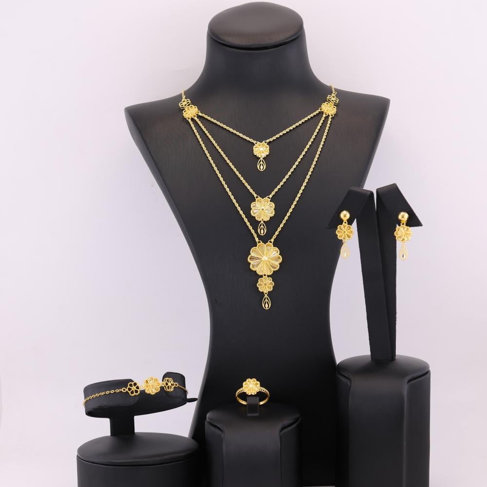 طقم ذهب ثلاث ادوار مبروم مع ازهار  -  عيار 21