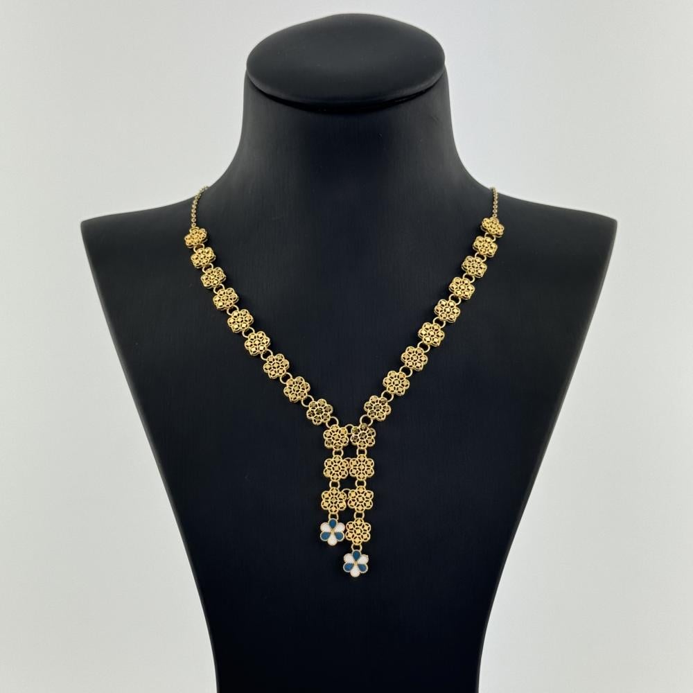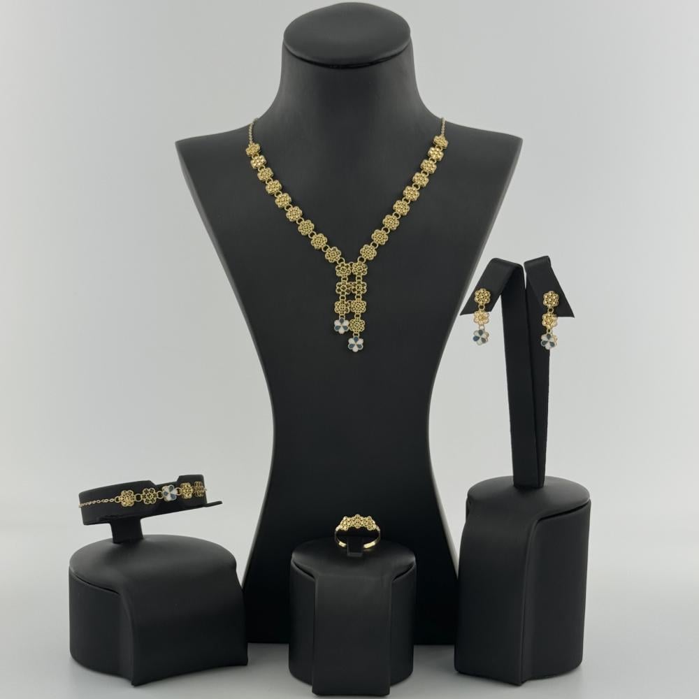 طقم ذهب ثلاثي الأبعاد عيار 21 يتكون من مجموعة رائعة من الورود الجميلة المصممة بدقة متناهية. تتميز القطع بتفاصيل دقيقة تبرز جمال الورود وتجعلها تبدو وكأنها حقيقية. العقد يتوج بجماله وردتين مميزتين بألوان الأزرق والأبيض، مما يضفي لمسة من الأناقة والجمال الراقي. هذا الطقم مثالي لإضفاء لمسة من الفخامة والجاذبية على أي إطلالة، ويعكس الحرفية العالية والإبداع في التصميم.